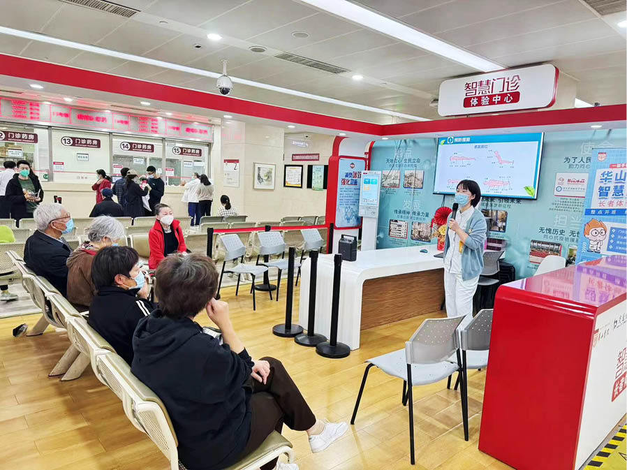 在推進新技術(shù)應(yīng)用的同時,華山醫(yī)院考慮到目前還不能熟練使用智能設(shè)備的老年患者,開設(shè)智慧門診長者中心,教老人學(xué)習(xí)“掌上就醫(yī)”
